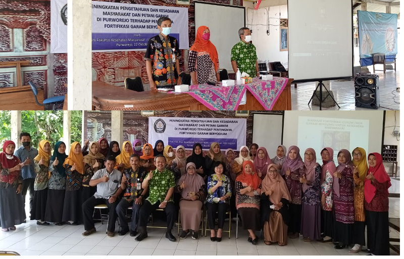 “Gangguan Akibat Kekurangan Iodium (GAKI) merupakan penyebab retardasi mental terbesar yang dapat dicegah, salah satunya dengan cara setiap rumahtangga mengkonsumsi garam beryodium” demikian disampaikan oleh Ir. Suyatno, Kes. selaku ketua tim pelaksana pengabdian kepada masyarakat dari Fakultas Kesehatan Masyarakat  Universitas Diponegoro (FKM Undip) pada saat memberi sambutan pembukaan kegiatan pelatihan peningkatan pengetahuan dan kesadaran masyarakat dan petani garam di Kabupaten Purworejo terhadap pentingnya fortifikasi garam beryodium (22/10/2022). Kegiatan pelatihan diselenggarakan di Puskesmas Grabag, Kecamatan Grabag, Kabupaten Puworejo, Jawa Tengah dengan peserta 40 orang terdiri dari perwakilan pengurus PKK kecamatan dan seluruh desa di Kecamatan Grabag, serta 3 peserta utusan dari petani/petambak garam di kabupaten tersebut  Pelatihan dihadari pejabat terkait dari dinas kesehatan Kabupaten Purworejo dan kepala UPTD Puskesmas Grabag Pada kegiatan pelatihan tersebut.  Bertindak sebagai narasumber adalah dosen bagian gizi kesehatan masyarakat FKM Undip.