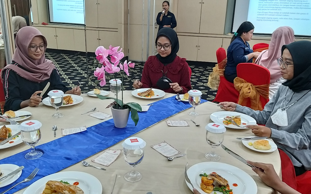Mahasiswa adalah calon sarjana yang ketika lulus nanti diharapkan menjadi eksekutif muda yang akan memiliki lingkup pergaulan luas, dan besar kemungkinannya suatu saat akan menghadiri acara jamuan resmi yang menuntut penguasaan tatakrama yang baik sehingga dapat menunjukkan sikap yang elok selama perjamuan makan berlangsung. Dalam pelatihan table menner, mahasiswa dikenalkan dengan aturan umum yang digunakan ketika sedang mengonsumsi makanan, termasuk di dalamnya penggunaan alat-alat makan hingga posisi duduk yang baik. Mengingat masih dalam suasana pandemi covid-19, maka pelatihan dilaksanakan dengan memperhatikan protocol Kesehatan, dan sebelum pelatihan semua mahasiswa dipastikan dalam kondisi sehat berdasarkan pemeriksaan antigen. (Syt)